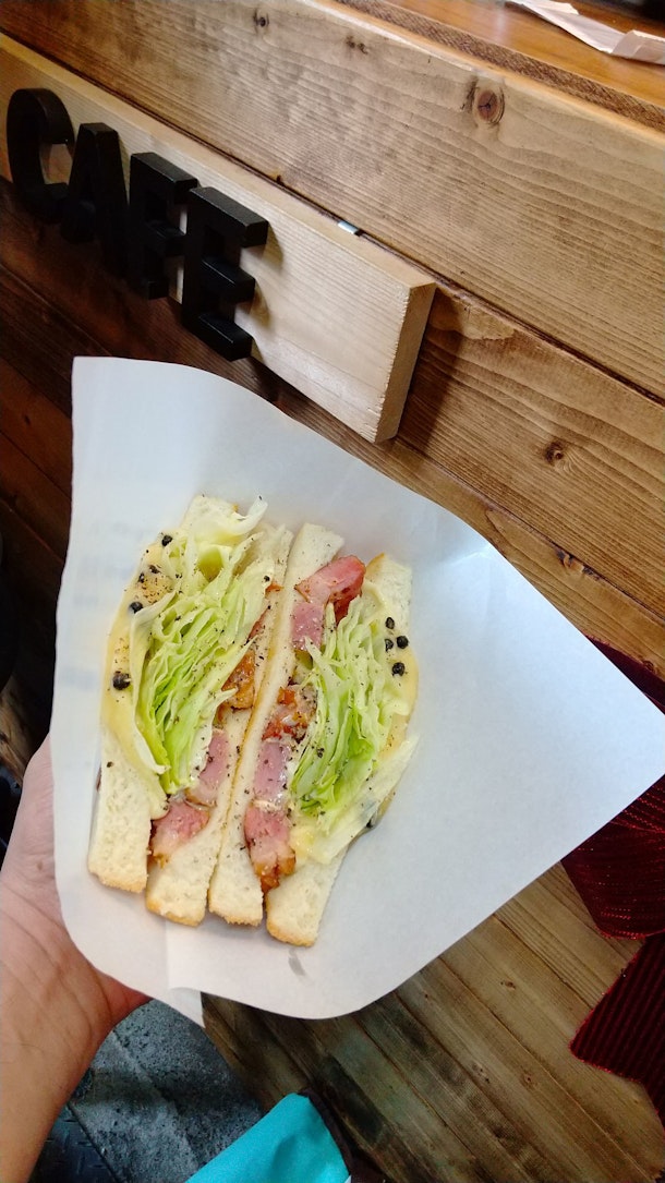 このホットサンドには、生コショウが粒でたっぷりと入ってます。今回はアメリカに住んでた経験のある、おにーさん曰く、日本の普通のサンドだと満足しないんでうちのは頑張ってますとのこと。