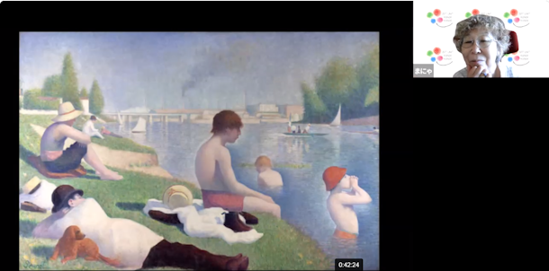 最初は夏の休日の風景の様子から話が始まり、だんだんと、奥の工場の煙突やボートで遊ぶ富裕層の人々が見えてきたり、水辺に腰かけている人の表情の暗さや、あきらめ、というような人々の感情表現の話へと深まっていきました。