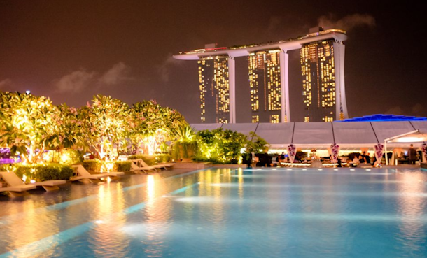 エレベーターのドアが開くと、青いイルミネーションに挟まれた屋外プールと奥に見えるマリーナベイサンズのインパクトが強くて心地よい気候と音楽に酔いしれること間違いなし!!女性はこんなところでプロポーズされたらYes以外の答えはないと思ってしまうくらい綺麗です♡