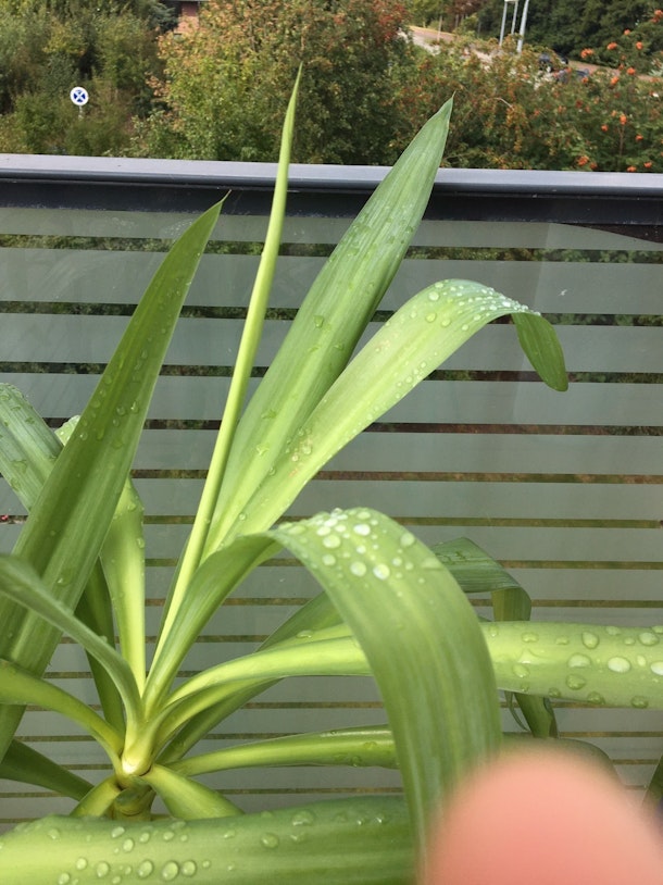 めっちゃ指写っていますが(笑)、観葉植物についた雨粒が雨の量をうかがわせます。