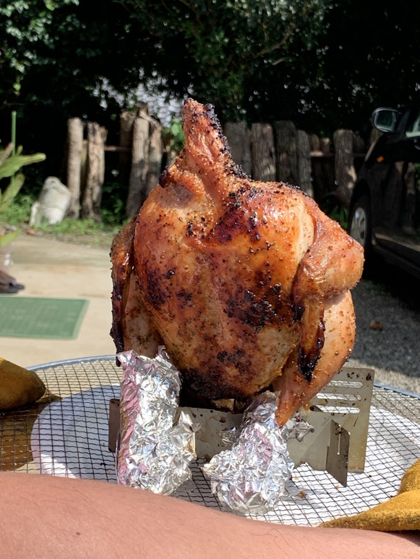 で、今企画している夜風と夜空を楽しむ体験の時に出してみようかと考えているビア缶チキンを試したところ、すごく美味しそうに焼きあがりました^^