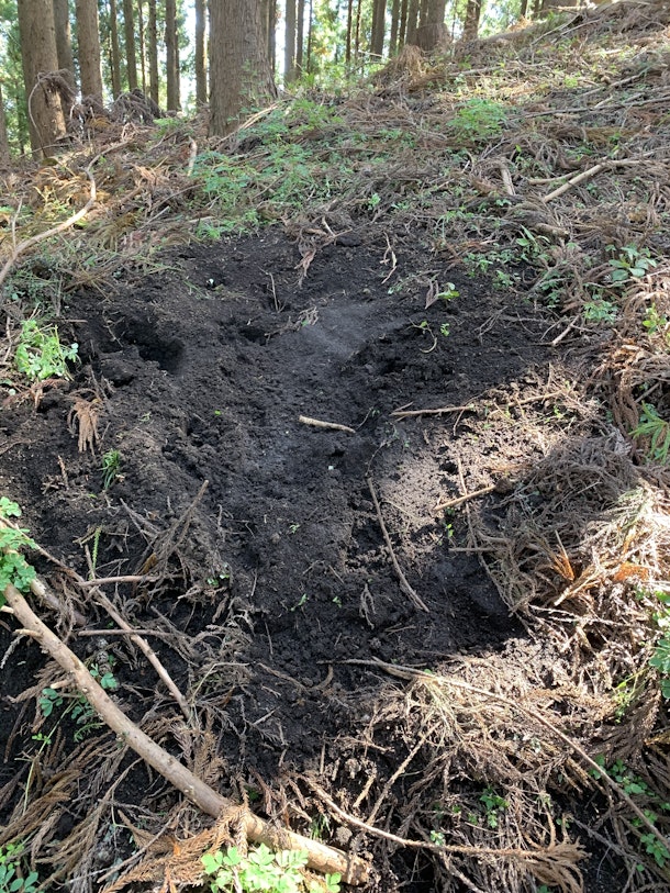 落ち葉や枯れ枝の真ん中に黒土が剥き出しになってます。