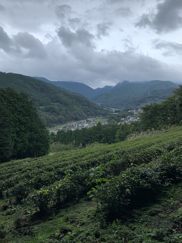 佐藤さんの茶畑は寄(やどりき)の集落が一望できます。