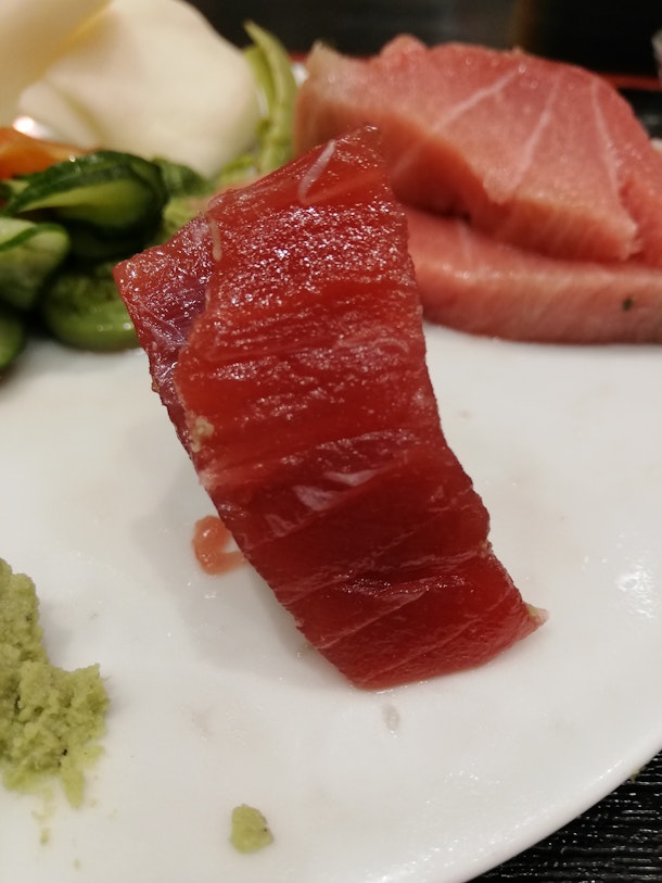 大間産、生マグロ・・・うしろのピントが甘いのが中とろですね。