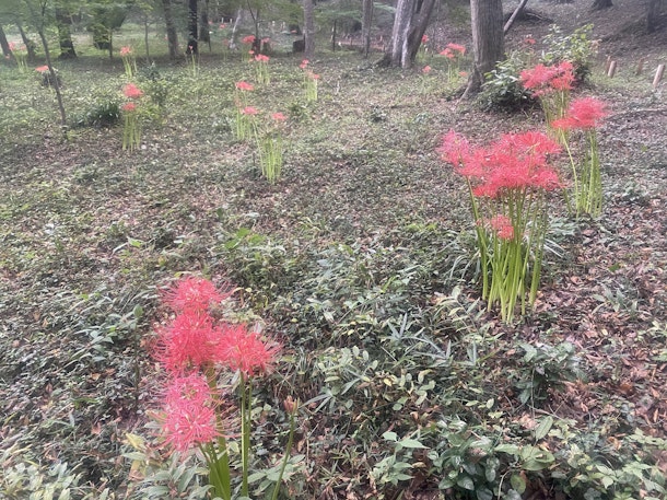 いつもの狭山緑地トレイルの窪地にこんな彼岸花の群生地も発見でき、