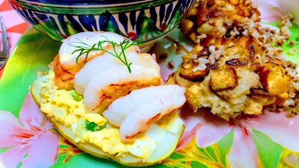 暖かいOLIVIE エビとサーモン入り 優しい味の卵ソースあえ (左)