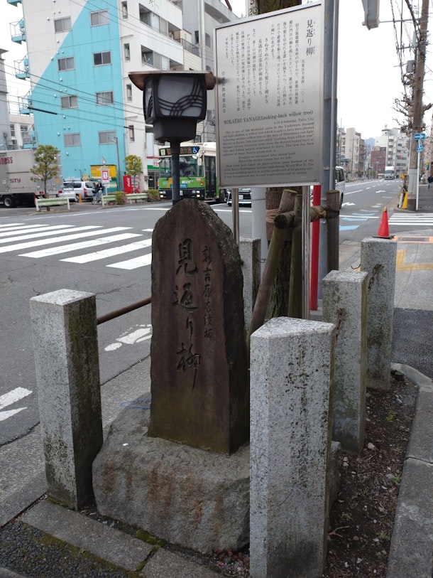 吉原遊郭入口付近にある、「見返り柳」。遊廓で遊んだ男が、帰り道に柳のあるあたりで、名残を惜しんで後ろを振り返ったことからこの名が付いたとの事。