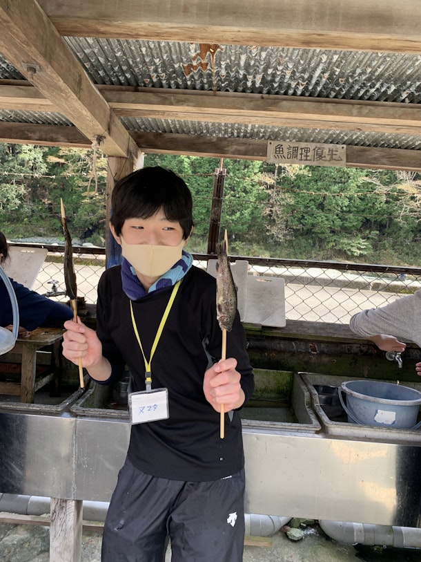 写真はマス釣りばで魚を釣り、自分で捌いて串を打ち、これから囲炉裏端で焼きに行こうとウキウキしている中学3年生(笑)
