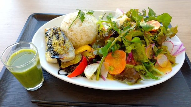地元野菜や姉妹都市の佐久から来た有機野菜サラダとサワラのプレート。ミニ麹スムージー付き!