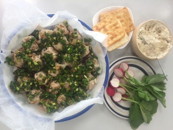 左がネギたっぷりのせ納豆焼売、右上が納豆クリームチーズディップ