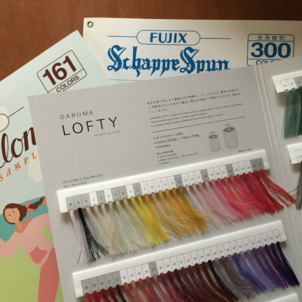 写真は秘蔵(?)のミシン糸見本帳コレクション。