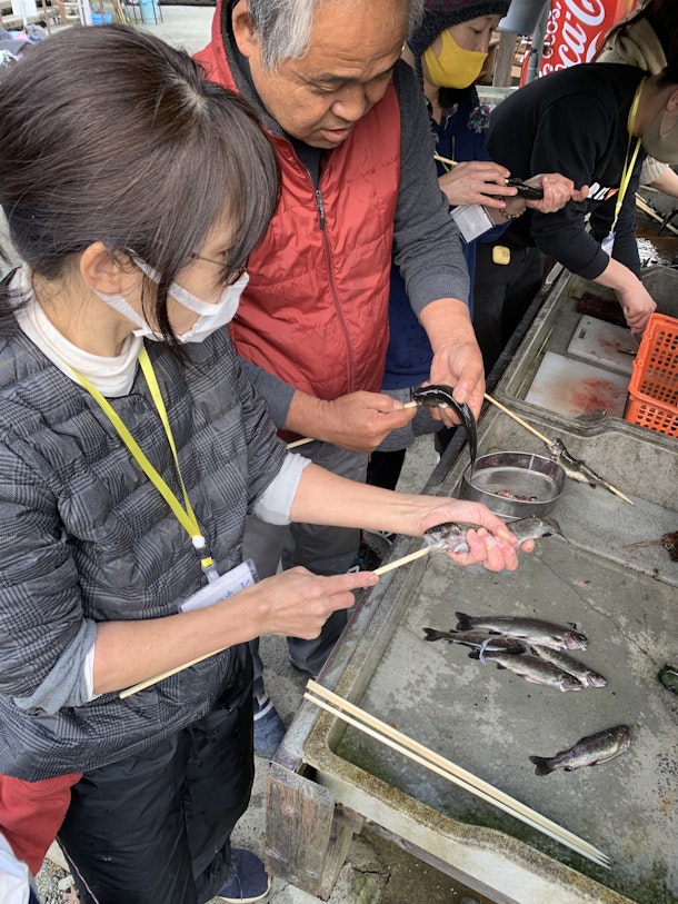 「ここにエラがあって、ここが繋がってるから切断するんだよ。そうじゃないと魚がずっと動くんだよ」