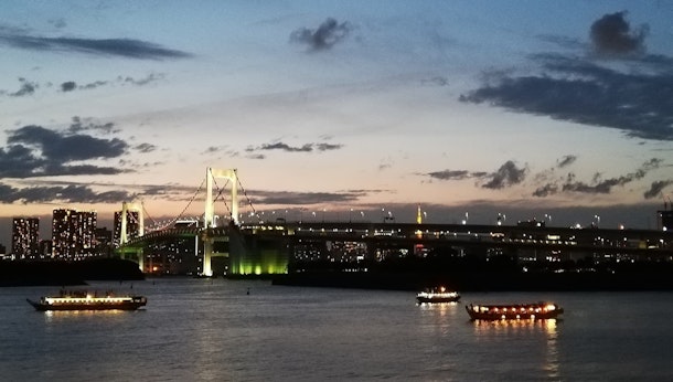 レインボーブリッジ、東京タワー、海、都心部のビルディングの明かり。
