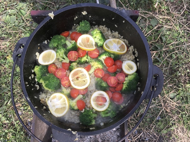 クリスマススペシャルということで、大小2台のダッチオーブンを使って「スタッフドチキン」と「シーフードパエリヤ」を作りました。
