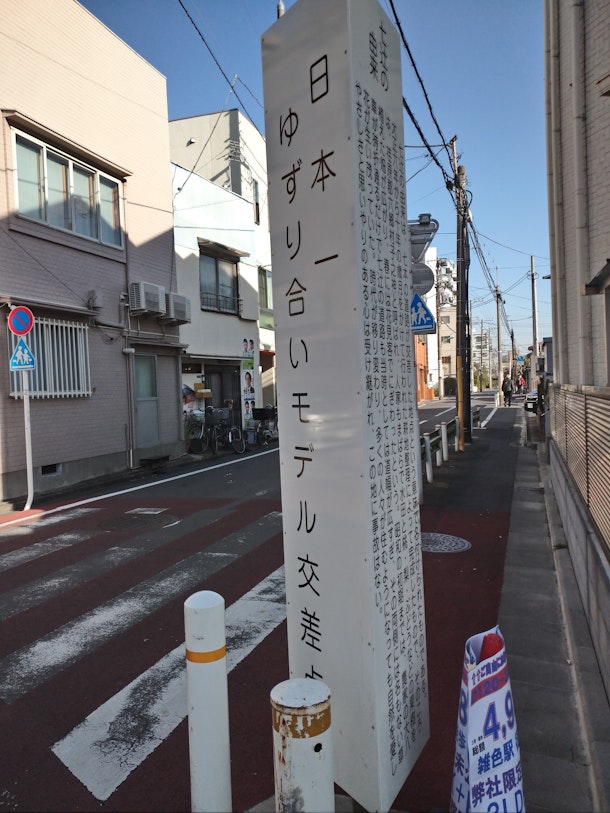 大田区萩中、南蒲田、東六郷、南六郷の境にある七辻(交差点)で、「日本一ゆずり合いモデル交差点」の看板が立つ。