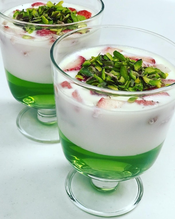 しばらく前に手に入ったハラールゼラチンで🍏と🍓とピスタチオのプディング的な物を作ってみました😊