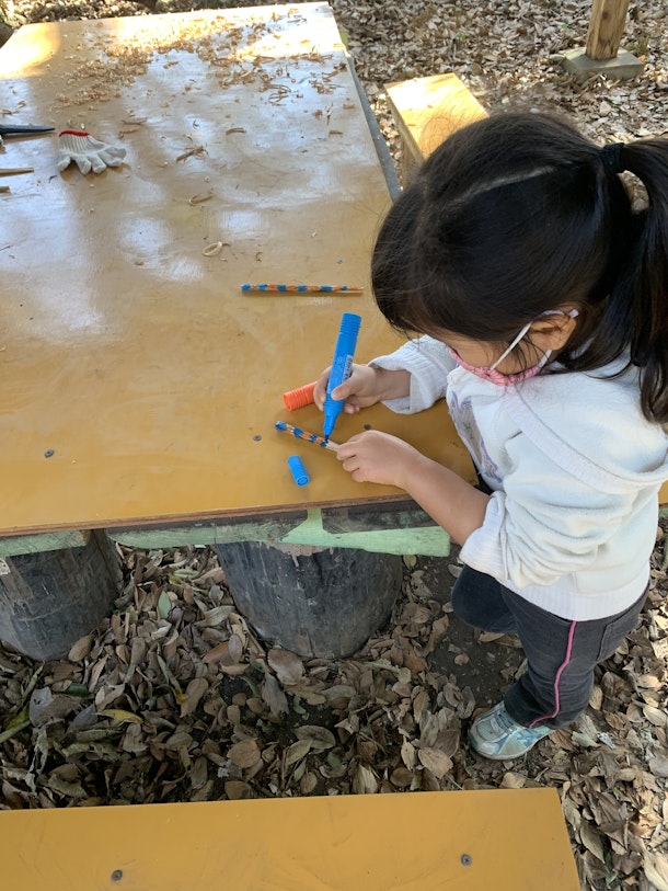 主な体験は、ナタや手斧、ナイフでの薪割りや、箸作り。色塗りも一生懸命です。