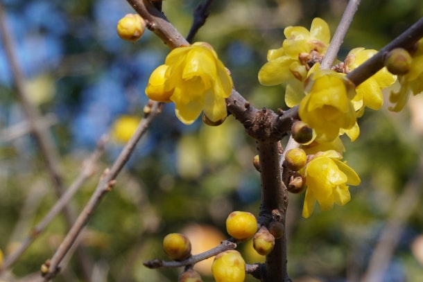 元日から紅梅、蠟梅、白梅にであい、ヒマラヤユキノシタにも出会いました。