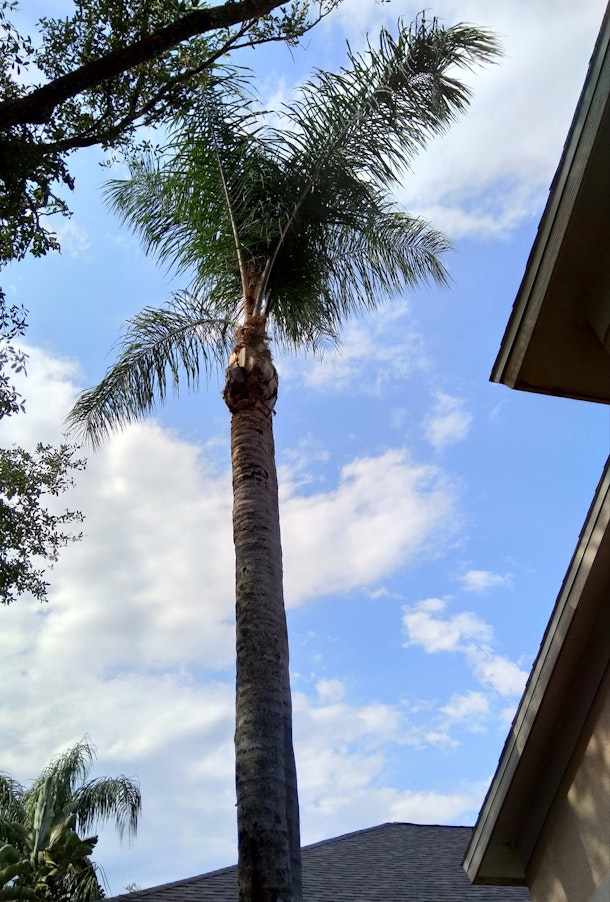 ヤシは稲と同じ単子葉類。クイーンパームというヤシはどんどん大きくなり、葉を茂らせます。そこですっきりカット。このカットの名前はハリケーンカットと言います。ハリケーンの時に強い風を受けても倒れないようにシーズン前に葉を減らします。痛んだ木をドスンドスンと伐採してもらうのもこの時期です。けど、お国柄でしょうか、周りにある植え込みにはあまり心配りをしてくれません。木のカットだけに集中しています。