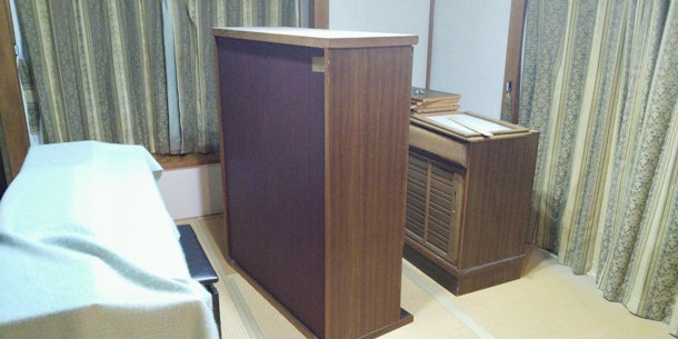食器棚の上部を下におろし、粗大ごみの日までの2日間、和室に待機させておいた時の様子です。六畳の和室がとても狭く感じました。(ちなみに左奥に写っている黒いものは電子ピアノです。こちらはリサイクルショップへ持っていきました。)