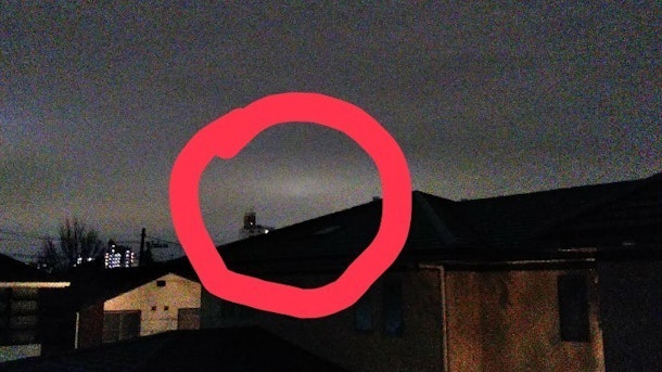 写真だとわかりにくいのですが、光っている雲の中に月のように光っているのがUFOなんです。