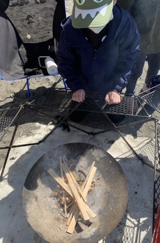 お兄ちゃんはファイヤースターターに夢中になって、一発点火後も練習したくてたまらない様子。妹さんはまだ年中ですが、マッチに興味津々。上手に点火できました。