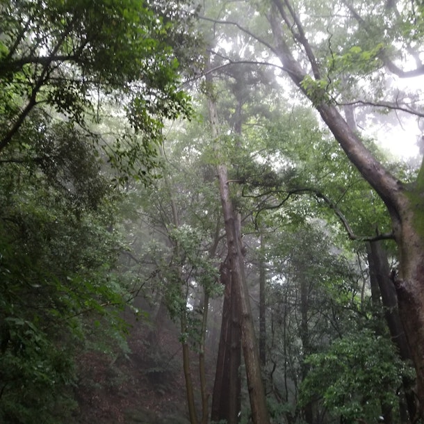 小雨降る朝の森で自分自身の穢れを祓う。
