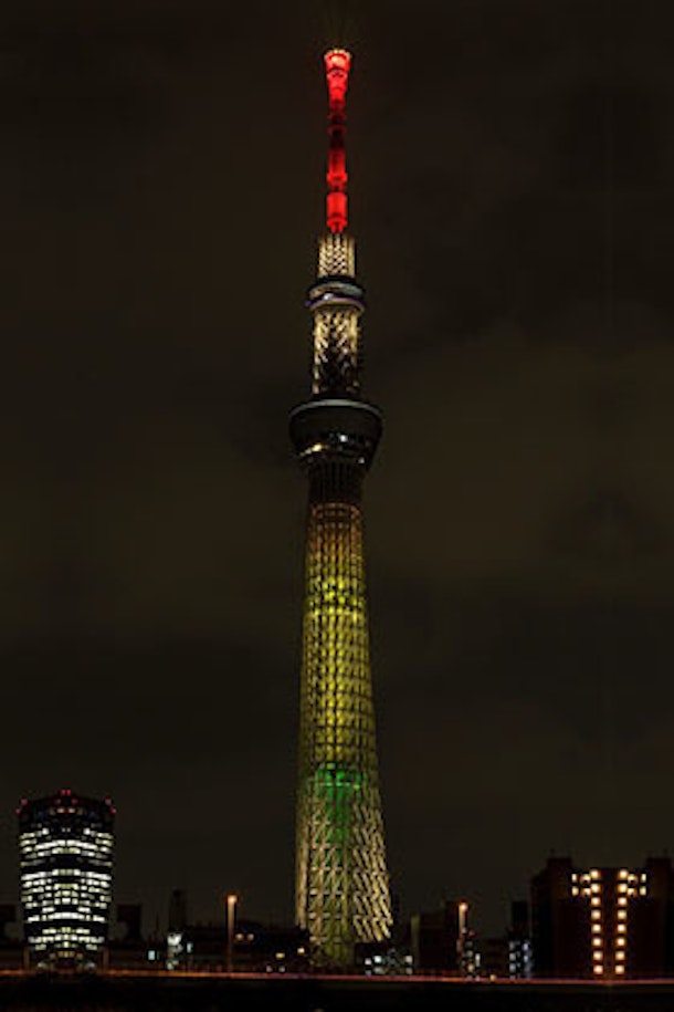 17:45~22:00は東日本大震災で被災された地域の復興への想いを込めて「明花」を点灯いたします。「明花」は「明るい未来」をテーマに、2013年に地元墨田区の小学生からライティングデザインを募集して作成した特別ライティングです。きらきらとした太陽の光が降り注ぎ、種がまかれ、芽吹き、青々とした葉が開き、そして色とりどりの5種類の花(①明花、②ハイビスカス、③マリーゴールド、④ゆり、⑤ラベンダー)が咲く様子を色鮮やかなグラデーションで表現しています。