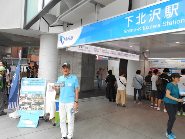 下北沢駅で「タビカ・小田急線」のチラシを配っています。