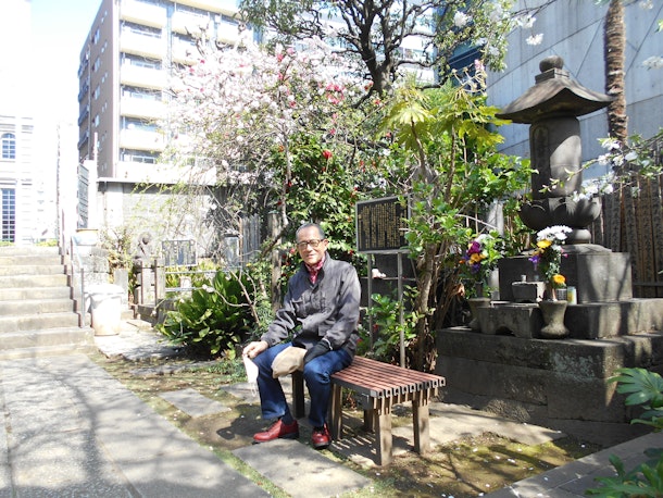 三月23日に奪衣婆像を案内するタビカまち歩きを開催しました。【東京遊女物語・新宿東】甲州街道から二丁目、玉川上水跡、歌舞伎町を巡る https://tabica.jp/travels/3423 、女性一人が参加され、良い天気でした。①飯盛り女が投げ込まれた成覚寺の境内は赤白の桃の花が満開!ホストです。