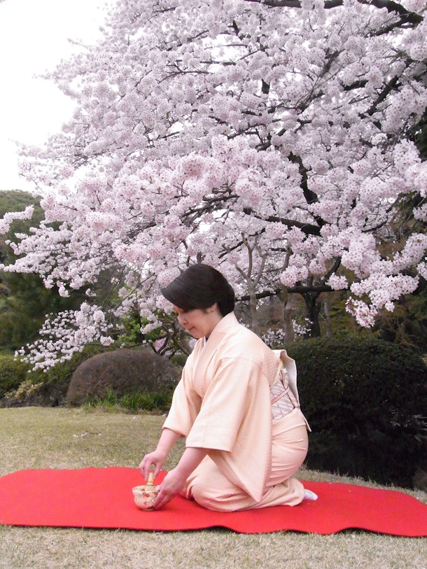 過去のものですが、桜の木の元で茶道を披露した1枚を。