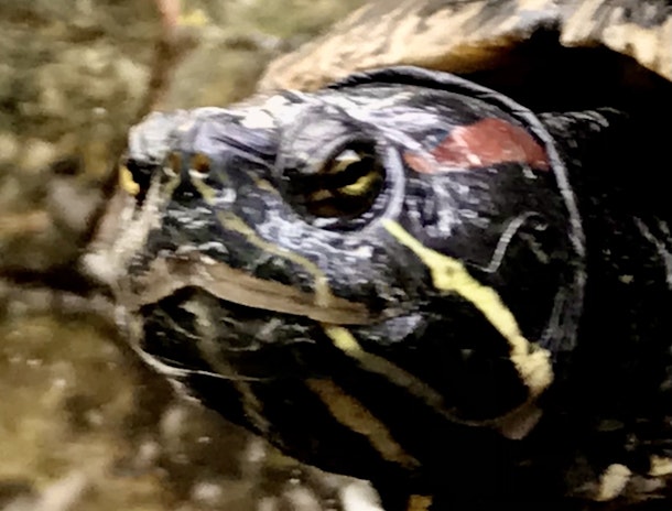 駅の中の小さな池に、もう何年も飼われている数匹の亀。やぁでかい、その中でも一番でかいのがこの、ボス亀くん。顔相に年輪と共に、哲学者的な香りを感じませんか。(大雄山線大雄山駅内)