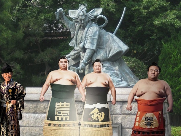 - 撮影方法 参加者とご両親や家族が暫銅像前に並び、その両脇に相撲協会のご厚意で国技館からお借りした現役の大関「貴景勝 関・正代 関・朝乃山 関」の三大関の等身大写真パネルと行司を配して撮影。