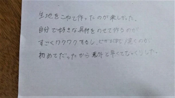 ピザを作ったことはあるけど、ピザの生地から作ったことはなかったから体験することができて良かった。生地を作る時に生地をかためるこうていで生地をこねるのが楽しかった。