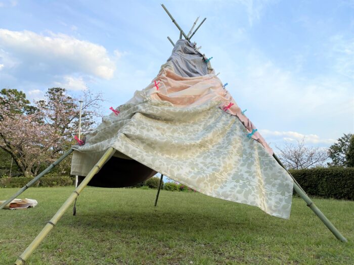 ①1本の支柱を建てて、そこに円錐形に布を張っていくスタイル