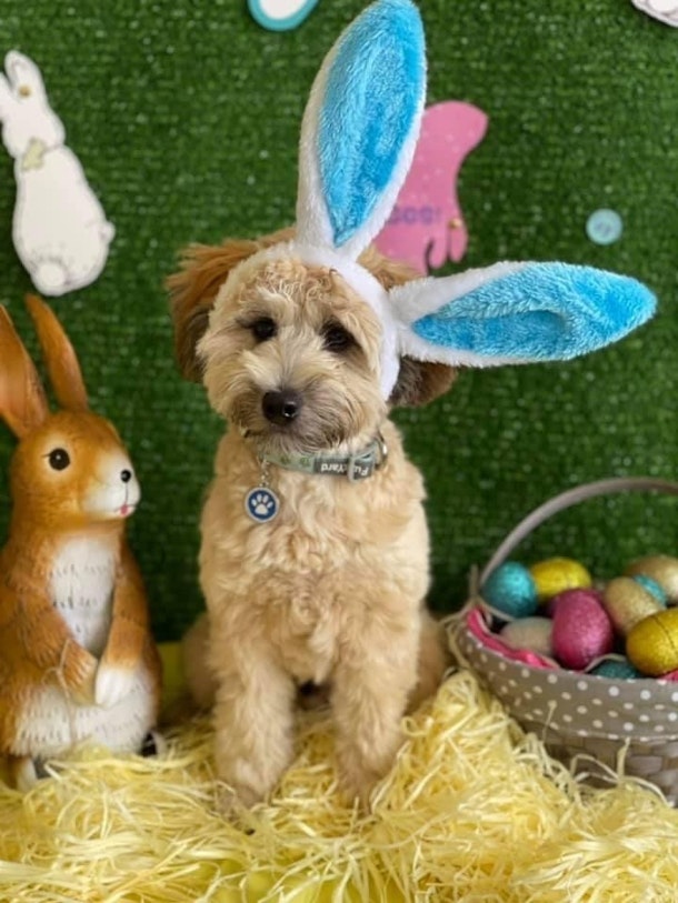 今月あたまのイースターに、子犬の幼稚園ではコスプレさせられたみたい。“Happy Easter!!” (ちょい迷惑そうな顔をしてます)