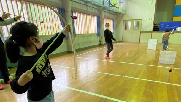 子どもたちは体育館につくやいなや、マイ弓矢を試し打ち。