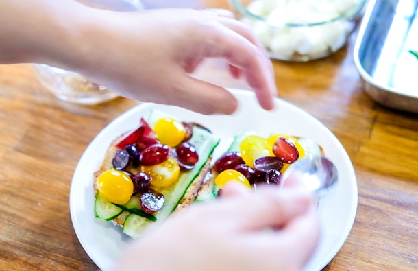 レッドクリムゾンとチェリートマトをはちみつビネガーでマリネして、ピーラーしたきゅうり、モッツァレラと、トーストの上に構築していきます。