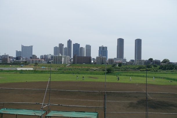 多摩川を見渡して説明していましたが、グランドも小池商店にも