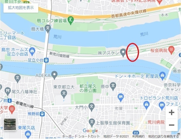 左が荒川、右が隅田川です。土手を挟んで左右にあります。まさに最接近。