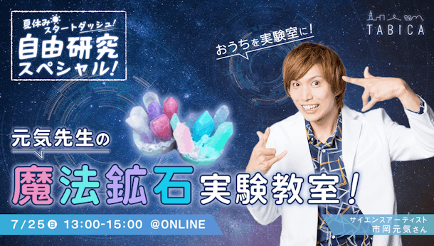 今回は、でんじろう先生の元助手で「おはスタ」や「嵐にしやがれ」にも出演された大人気サイエンス・アーティスト市岡元気さんをお招きして、「魔法鉱石」を一緒に作ります!そのまま自由研究の課題としても提出できるかも?