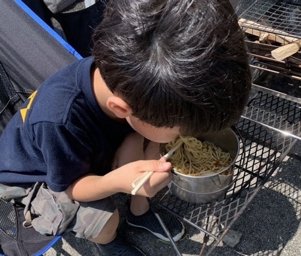 焚き火ラーメンでは小学一年生のお子さんの焚き火に最初に火が入り、そのまま一番で完成。