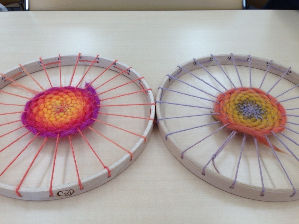 手作りの好きな方、織るという体験はいかがでしょうか?円形織りです。でき上がったモチーフは、ご自身のバッグや帽子、マフラーに縫い付けるもよし、オブジェとして飾ってみるのもおもしろいですね。色を楽しむ、色をぶつける体験をしてほしいです♪