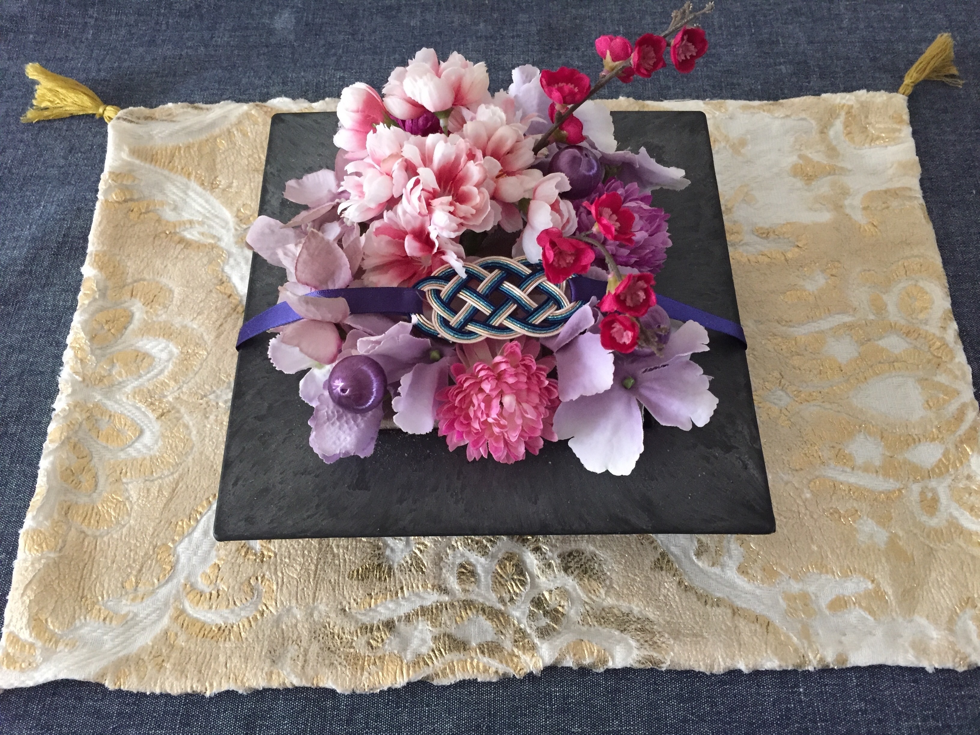 アーティフィシャルのお花を使って春の温かみのある色合いのフラワーアレンジを作ります。