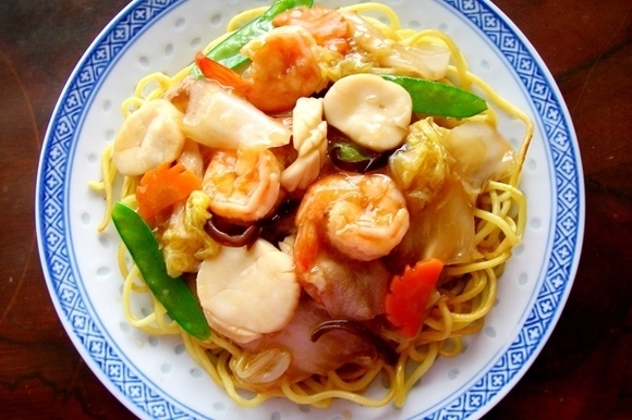 初心者さんシリーズ:中華麺をしっかり焼き付けるのがコツ。海老・ホタテ・イカのトローリ餡をかけて。丸めて加熱手抜き焼売。油分を流す薬膳スープ