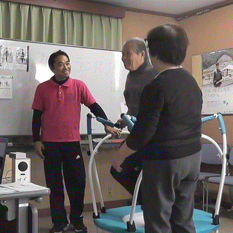 【ゲストへのご挨拶】初めて運動するような方でも、運動指導のプロがついていますので安心して運動することができます。手すり付ケアトランポリンをメイン健康器具としていますが、写真のように色々な器具があります。個人レッスン 5000円運動が初めての人でも楽しく運動して頂いてます。