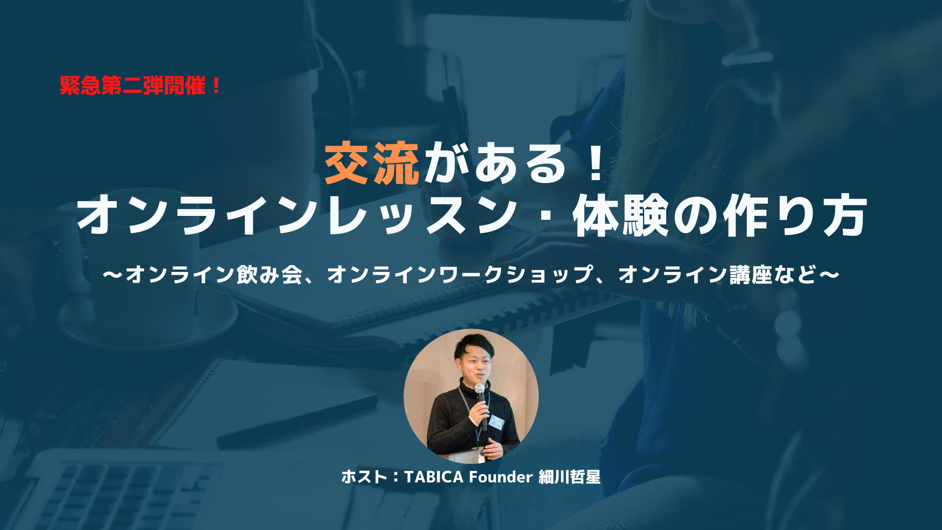 【ゲストへのご挨拶】【"交流"がある体験編】新型コロナウィルスの影響を受け、注目が集まるオンラインイベント。 チャレンジしてみようかと考えているホストの方も多いのではないでしょうか。▼▼この体験はオンライン(ZOOM)で開催します▼▼◼︎◼︎体験概要会場という場所の制約がないため、遠方の人も含め、多くの人に参加してもらえる可能性があったり、育児や介護、怪我などで家を離れられない人も参加できたりするオンラインイベント。今回は、オンライン飲み会、オンラインワークショップなど交流のあるオンラインレッスン・体験に特化したイベントノウハウについてお話をお伺いします。※TABICAでもオンライン体験を開催しておりますhttps://support.helloaini.com/hc/ja/articles/900000239906◼︎インフルエンサー阪口 ゆうこ氏( http://sakaguchiyuko.blog.jp )圓尾 瞳氏( https://www.instagram.com/hitomimaruo )※今回は、お二人と一緒にZoomの使い方を学ぶイベントです。◼︎主催ホストTABICA運営 細川哲星◼︎◼︎当日の予定スケジュール19:20 開場19:30-19:35 オープニング19:35-20:15 交流のある!オンラインレッスン・体験の作り方20:15-20:30 質疑応答※予告なく変更となる場合があります。予めご了承下さい。■開催概要・Zoom(https://zoom.us/) を利用して開催します・Zoomは、PCでもスマホでも利用可能です。ブラウザでもアプリでも利用できます・開催日になりましたら、URLをお送りいたします