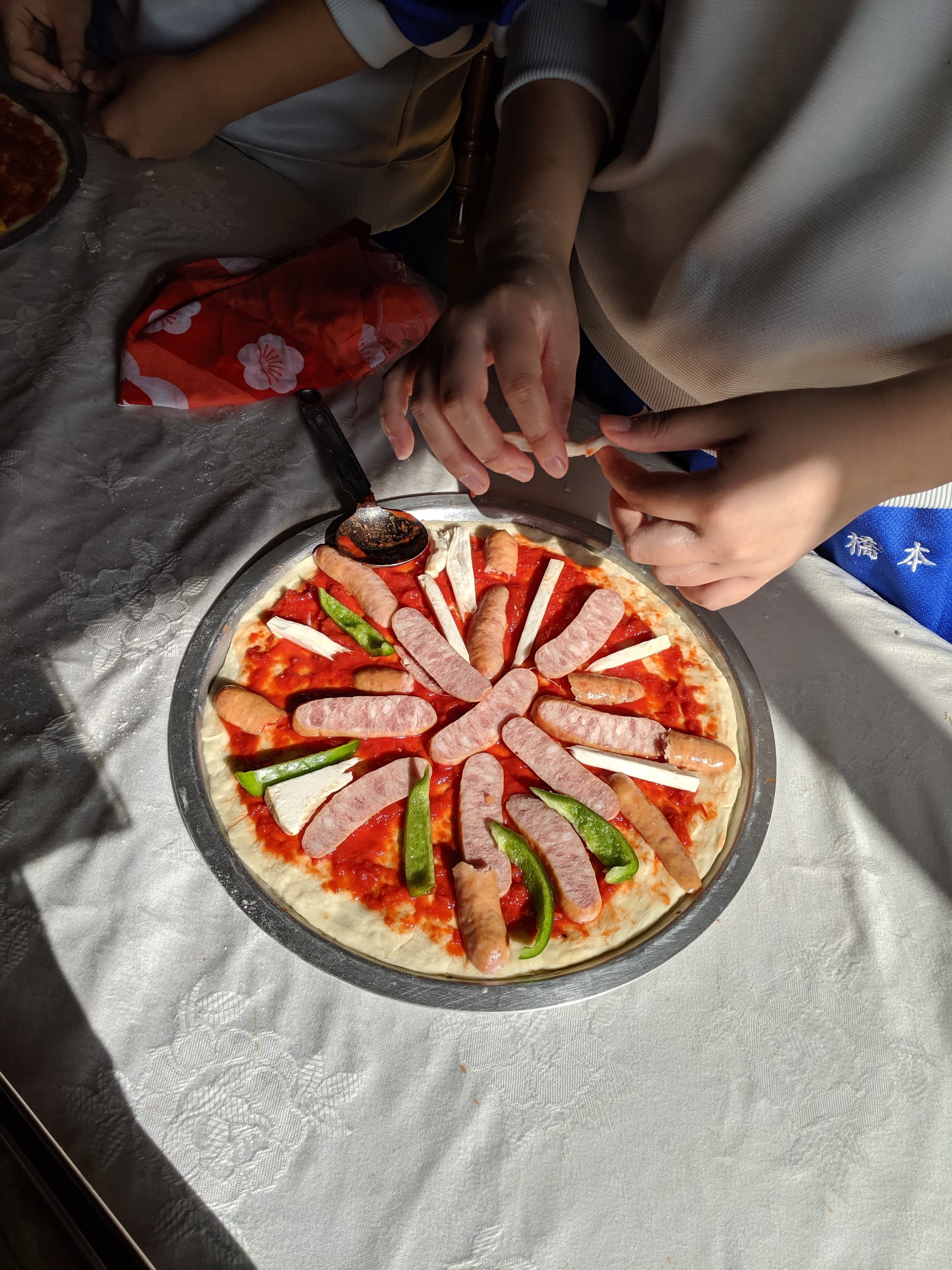 第一次発酵・二次発酵を完了させて、ピザ皿に生地を延ばして具材のチョイスをしてトッピングをします。