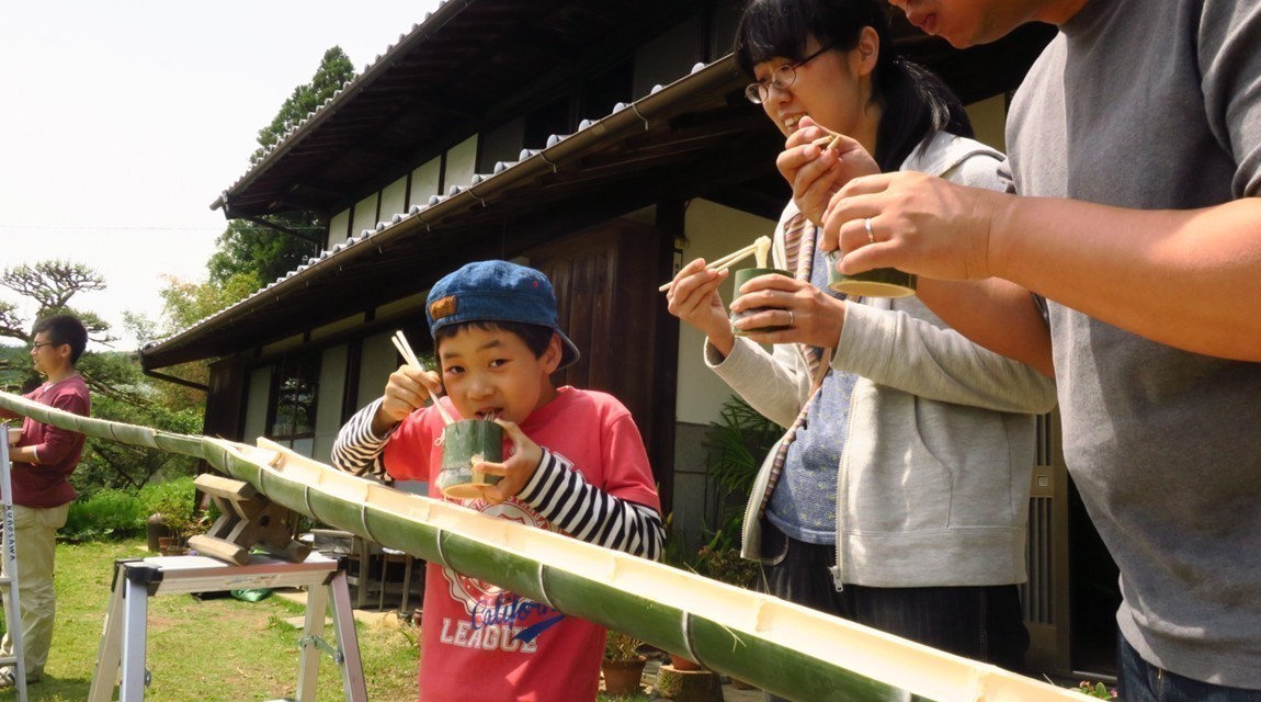 薪を割って竹を切ってレーンもお椀も作る流しそうめんで自然満喫