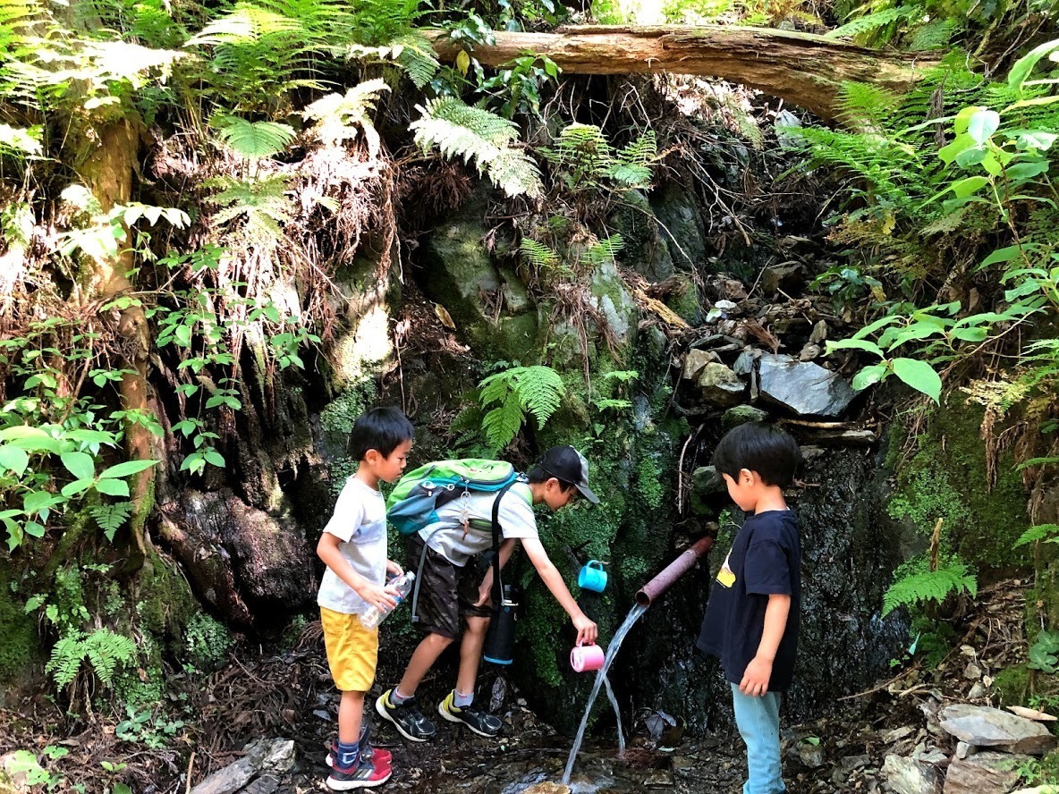 高尾山の湧き水は15年前に降った雨水が15年かけて山の中でろ過されて湧いているもの。子供たちにとっては自分が生まれる前に降った雨です。冷たくてとってもおいしいです。